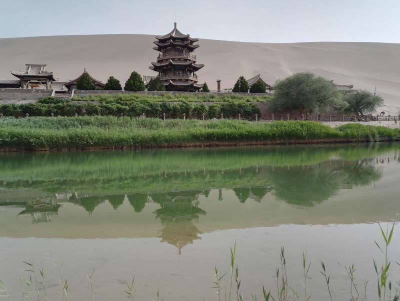 2、月牙泉:月牙泉是沙漠中的一片綠洲,泉水清澈甘甜,四周綠樹成蔭,景色宜人,您可以感受到沙漠與綠洲的交融之美。